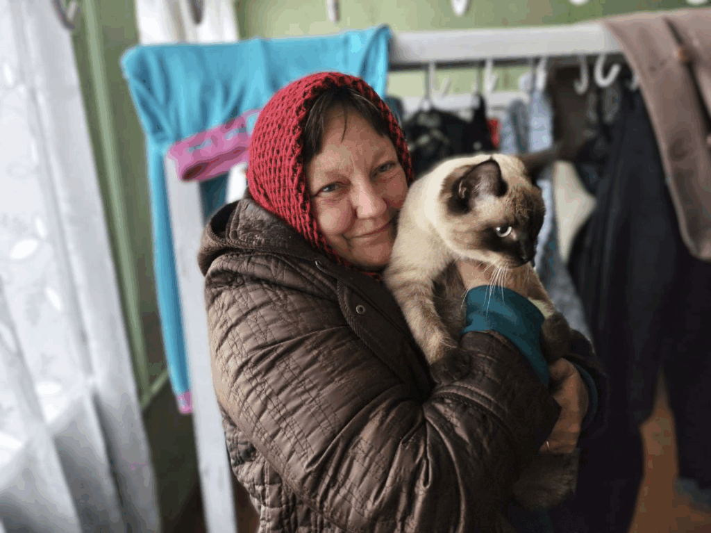 Victoria and her cat Malyuk. Photograph: Caritas Ukraine